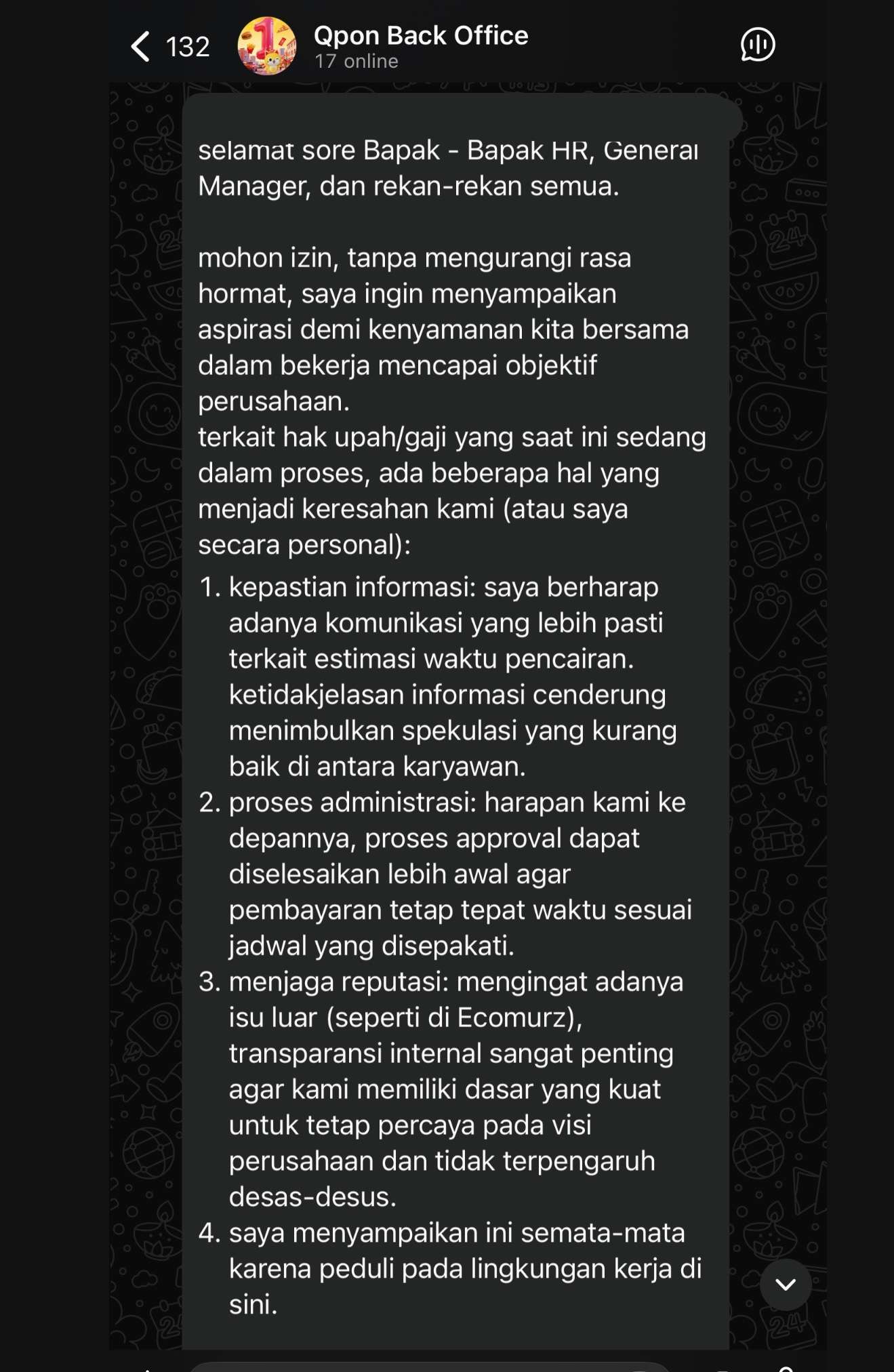hi fam, just wanna give a small update on that salary concern we raised earlier... turns out it wasn’t overthinking after all OMGGG HUHU gajian is on the 5th, but as of today it’s still “process approval” waiting for our beloved chinese CEO huhu no clear timeline, no official announcement, no proper communication, all we got cuma balesan imut : sabar eakkkkk 🙏 dari HR nya wow very professional <3 WE GOT BILLS TO PAY !!! @QPON woi kasian banget yg punya tanggungan untuk suami istri anak keluarga ortu cicilan... ini sekantor ud ngang ngong banget people are anxious, confused and tired of all this drama... udah peraturannya makin aneh2 hrs clock in exactly at 9 sharp (dimintanya sblm jam 9 sih), no WFH allowed t-ta-tapi ini geng HRnya malah wfh suka2 hati... dateng juga ga 9 teng... gada izin cuti kok ga masuk WOIIIIIIII pls help us!!! muak banget kucing kuning gendut ini kurusin aj biar bubar @qponners better cari2 kerja lain deh dr skrg bau2 THR ga dibayar xixi <3